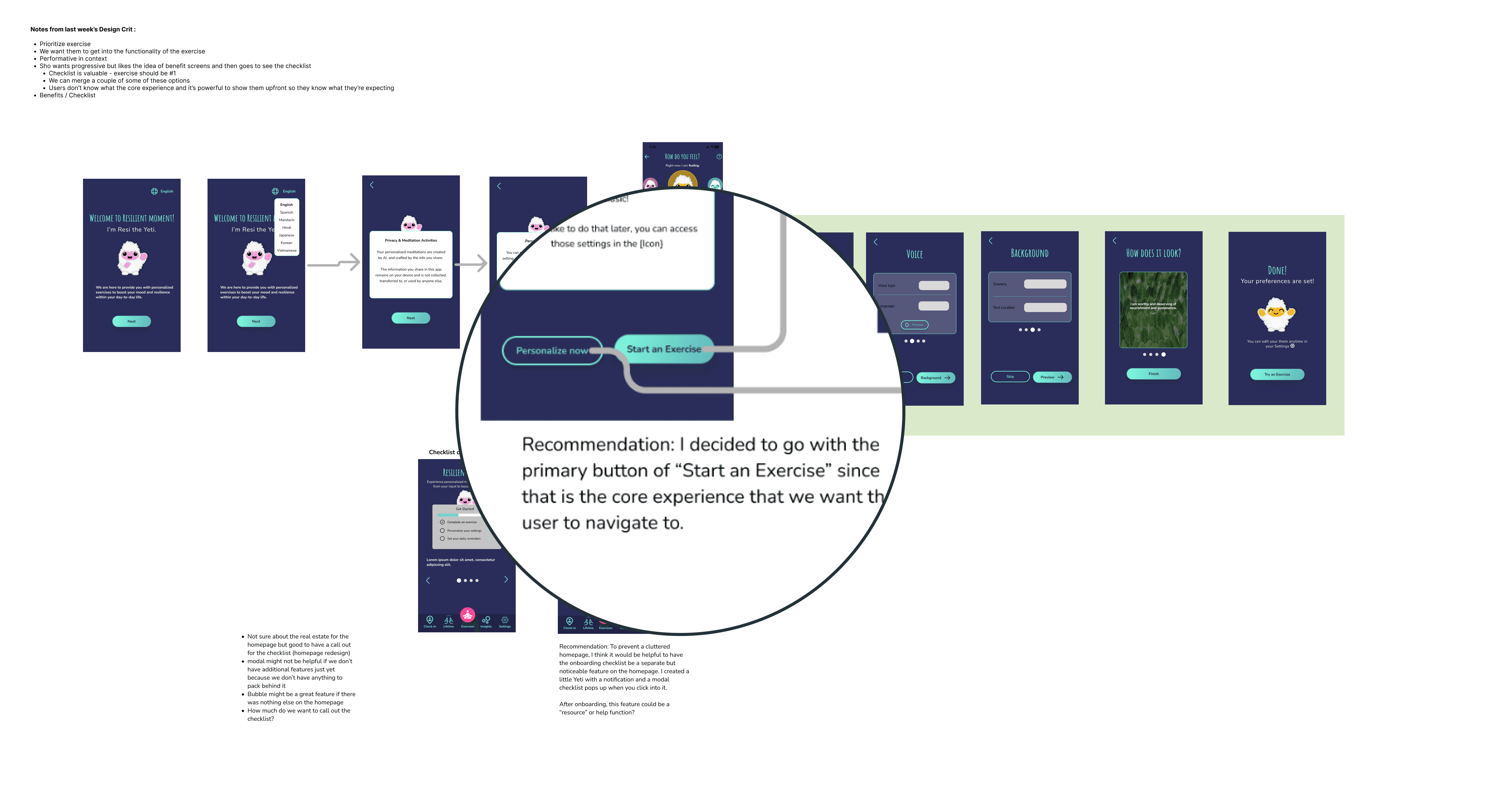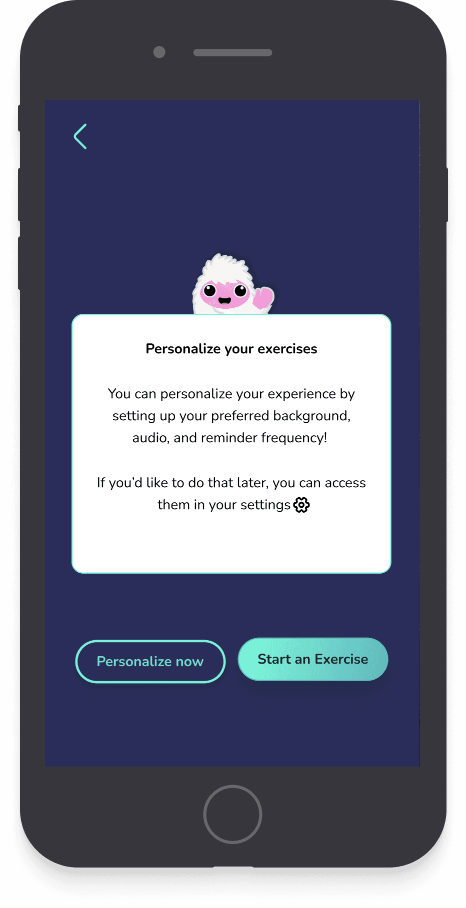 We wanted the onboarding experience to flow seamlessly into the starting the mental exercises so that the user is ready to start using the app.